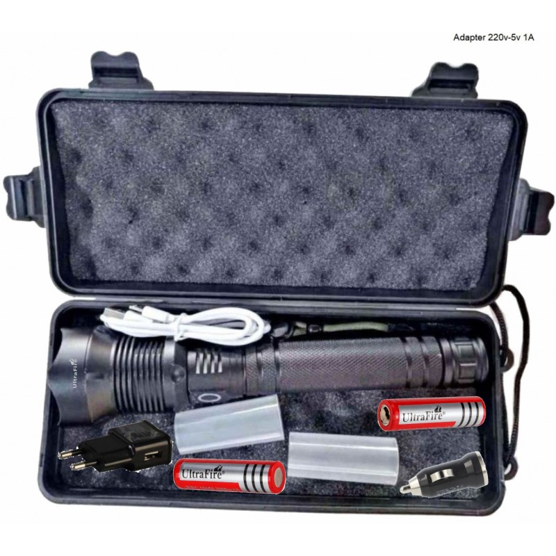 Set de Maletín, Linterna, dos baterías de 3.000mAh, Cable y Cargador USB y de Coche