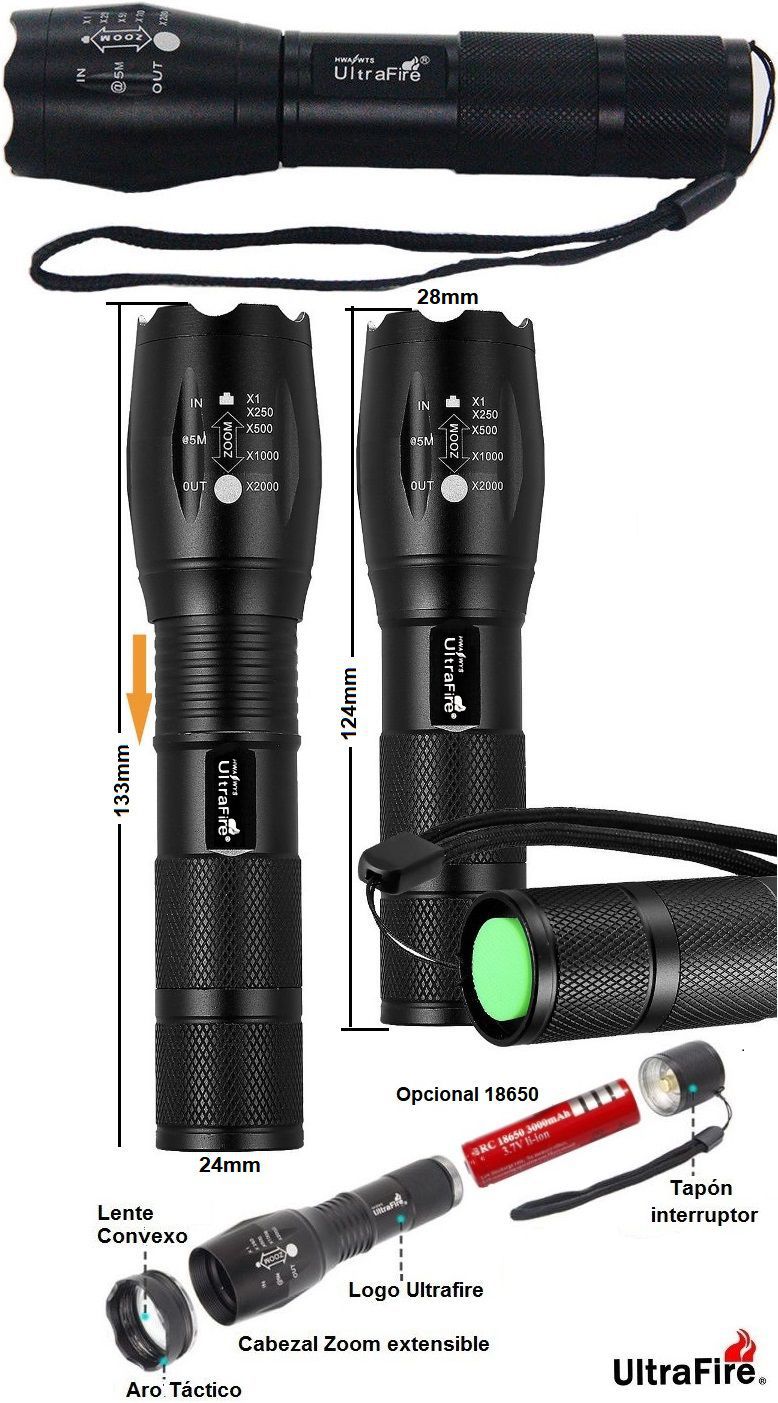Alimentación: 1 batería 18650 de 3.7v: o 3xAAA con adaptador (No Iincluida)· Resistencia al impacto: 1 metro